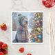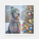 En irländsk Wolfthound som bär en stickad hatt och en färgstark sjal står bredvid ett dekorerat Julgran på en snödag