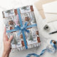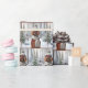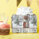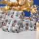 En irländsk Setter-hund som bär en grått-trikå står i en snöskog bredvid snögubbe för jul.