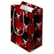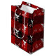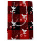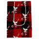 Vit duva med JY Jul-meddelande i snöflingor på rött och svart buffel.