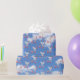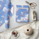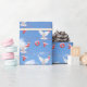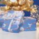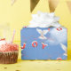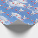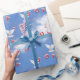Vit duva flyger i blå himmel med snö på rött JOY-meddelande på en röd och vit strimlad sträng till jul.