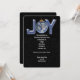 Julfest inbjudan med JOY-text i snöflingor och planeten jordens ornament på svart.