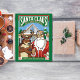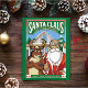 Den här juldesignen ser ut som en gammal spelsedel eller filmfilm som poster "Jultomten och Kicking Reindeer". Den här jultomten har en bakgrund med en kyrka, en Julgran med snö och snöflingor.