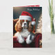 En Kung Charles spaniel-hund som bär en jultomte sitter på en röd stol bredvid ett glansande Julgran med blanka prydnadsföremål. All text kan ändras.