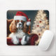 En Kung Charles spaniel-hund med en julhatt sitter på en röd stol bredvid ett glansande Julgran med blanka prydnadsföremål