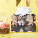 En Kung Charles spaniel-hund med en julhatt sitter på en röd sammetsstol bredvid en glödande Julgran med blanka prydnadsföremål