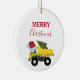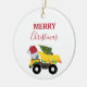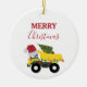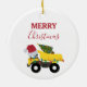 En söt illustration av lastbil fordon under julen i lastbil med en julhatt och dekorerade i ljus med ord i "God jul" som transporterar ett festligt Julgran. Perfekt för pojkar och flickor som kärlek bygger lastbilar, leksak lastbilar eller tunga maskiner. En idealisk julprydnad för stora eller små entusiaster från lastbil, flickor eller pojkar.