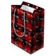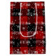 Vit LÅT DET SNÖA text med snöflingor på röd och svart buffelbaksida. Text kan redigeras.
