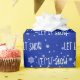 Vit LÅT DET SNÖA text med snöflingor mot blå bakgrund. Text och bakgrund färg kan redigeras.