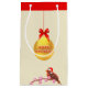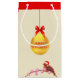 En vacker presentväska med en stor guldjul boll och en liten julfågel på ljusbeige bakgrund.