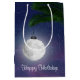 Gloling av måne-julprydnad som hänger på den tropiska handflatan mot stjärnbakgrund i himlar. Text kan redigeras.