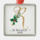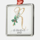 "Julmonogram R Guld Glitter Holly Foliage Metall Ornament." Hand målade vattenfärgen holly löv och röda burgunska vinterbär tillsammans med löv blad och guldgröna hand plockade. Monogrammet är tillverkat av ett guld-glitter-utseende, handskrivet manusmonogram brev P. Skapat av en internationellt licensierad artist, Audrey Jeanne Roberts, copyright.