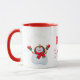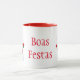 Keramiskt kaffe/te/kakao mugg visas med texten "Boas Festas" [God jul på språk från Brasilien till Sydamerika] i helgdag. Snögubbe trycks på båda sidor om mugg. Anpassa det här objektet eller köp som det är.