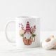 Vitlig nordlig gnom med rött hatt, sitta i en mugg-fullt med vinterblommor, bär, kanel, orange och candy cane tillsammans med en söt fågel med vinterhatt.