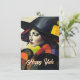 Ett jul- och vintersolståndskort med en häxa med rött hår och svart hatt. Framsidan säger: Gott jul. Baksidan säger: Och vintersolstånd. Detta är ett platt kort, tvåsidigt kort.