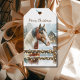 Söt personligens julklapp märkre. En söt brun och vit häst som står bakom ett gammalt skorstenshus med snöbakgrund och vintage gammal röd lada. Den snö-fyllda stängslet är försedd med belyst julklapp ljus till ge.. en varm känsla för julklistermärken i land för din jul till och från märkre i gåvor.
