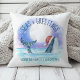 Tillsätt lite nautisk roligt till din helgdag-dekoration med den här julbomull dekorativ kudde som har en vattenfärgad val med en julhatt som simmar i havet under ett magiskt måne och stjärnor med ljus som dekorerar svan. Hälsningen "Seas & Hälsning" och "Wishing you a val of a bra jul" kan vara personlig. Omvänd sida är marin blå. Art av KL Lagrar