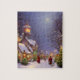 Det här pusslet har en bild av en vacker julby i vintage på en snökväll.