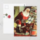 Retro illustration Julbild med en glad retro tomte som delar ut julklappar under julgranen på julafton.