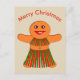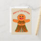 Det här vykortet har en söt tecknad av en färglös gingerbrödkvinna. Hon har svart ögon med vita elever och söt svarta ögonfransar och ett stort leende på ansikte. Hon har även röda och grönt på kjolen och det högsta redot för en jul party.