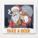 Illustration av Jultomten, med vitt hår och skägg, med glasögon, med en flaska av ölen i högerna och med lämnat hand röka en cigarr med en röd kostym med vit päls-trim, en svart bälte med ett låsbeslag av guld och en vit knapp. Bakgrunden är mörk blått med silhuetterna gräs träd och en stor grått-cirkel med ord "CHRISTMASS PARTY..." skrivet på den. Orden "TA A BEER" skrivs i orange brev vid grund i bilden. Stil är karikatyrartat med djärva konturer och platt färg.