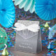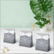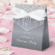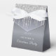 En faux silver-metallisk tittar bakgrund med faux silver glitter drop, lite av lek och lyx för dina julfavörer. Julgranar, vinterskog som dekoration på baksidan. Med texten: Jul Party skriven med ett modernt handskript i stil. Mall för din familj namn och ett år, vita brev. Modern, enkel och elegant.