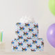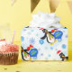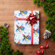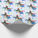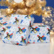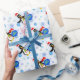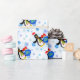 En tecknad pingvin klädd med en julhatt och vintersjal önskemål du en God jul. Snöflingor på en blå och vit övertoningsbakgrund omger den söta tecknadens penguin.