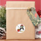 En tecknad pingvin som bär en tomathatt, som står bredvid en stor röd täckt gåva. "Ho, Ho, Ho" är det glädjande budskapet.