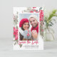Blommor och bär med elegant vattenfärg kapas i gräs och grenar. De skapar ett vackert ram runt ditt foto. Spara datumet skrivs i trendigets röda skript. Namnen och datumet följer nedan. Denna punkt är en del av Red Poinsettia Botanical Bröllop-samlingen.