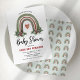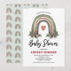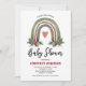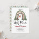 Rustika inbjudningar till bohemisk vinterbebis shower med en enkel vit bakgrund, en söt festlig akvarell boho regnbåge, elegant julgrönska & bär, och en modern mall för bebis shower som är lätt att anpassa.