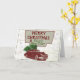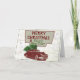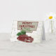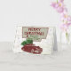 Ett vintage julkort med en klassisk bil som drar en julgran på taket med en karta i bakgrunden. Detta retro-inspirerade välkomstkort för högtider kommer att bli ett roligt kort att skicka ut under denna högtidssäsong.