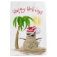 Cute snö sandman på stranden med solglasögon och strumpsockor som håller en ljussträng helgdag under jul handflatan träd. Den vita bakgrunden färg kan ändras.