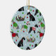 Kute julschnauzers med salt och peppar och svart och silver jackar bära jultomater, antrar och portilsvettare på blå bakgrund med utspridda prydnadsföremål.