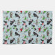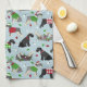 Kute julschnauzers med salt och peppar och svart och silver jackar bära jultomater, antrar och portilsvettare på blå bakgrund med utspridda prydnadsföremål.