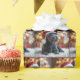 En svart skotsk hund som bär en tomtehatt sitter på ett fluffy matta framför ett festligt Julgran som är förankrad med ljus.
