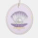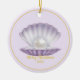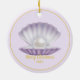 Denna keramiska prydnadsprodukt visas med en fin dekorativ snäcka i lila och vita toner med en bild av ett glaspärlande pärl inuti. Anpassadet "God jul 2025" finns i färg i guld. Har guld färg gräns. Bilder skrivs ut på framsidan och baksidan. Om du anpassar måste du tänka på att anpassa båda sidorna av den här dekorationen. Anpassa det här objektet med den här mallen eller köp som visas. Licensierad bild