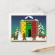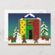En söt vinterscen med ett färgat hus med snö på tak. Snö omfattade träd, snögubbe och pepparkaksgubbar i snö.