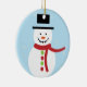 Lycklig jul snögubbe med scarf och hatt i blå botten med snöflingor.