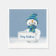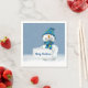 Cute snögubbe i snöflingor med en vit skylt i snö. Text kan redigeras.