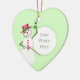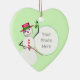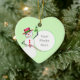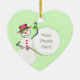 En hjärtformad julfotoprydnad med en snögubbe-kvarhållare över ditt foto! Anpassadets text längst bak säger "God jul".