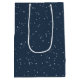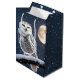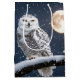 Snowy uggla vid träd gren med snöflingor och fullt på blå natten himlar