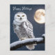 Jul Snowy Uggla vid träd gren med snöflingor och fullt måne på den blå nattens himlar från näringslivet. Text kan redigeras.