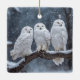Vit snöskiva i uggla i snöflingor på en vintertid träd gren för jul