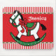 Förtjusande jul som vaggar hästen med den stora röda pilbågen. Perfekt för julbebis och ungar. Koordinerade anpassadebaby shower- och födelsedaginbjudningar, portofrimärken, minnessaklimbindningar, tote bags, magneter, informationsbladbrevpapper, kuvert, muggar, tackkort och mer. PinkInkArt original!