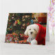 Bedårande valp som bär röd hatt med presenter och dekorationer.