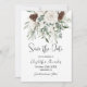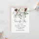 Jul Spara inbjudan till vinterbröllop Gräs Blommigt . Den här eleganten är vinter-bröllopet Spara datumkortet som dekoreras överst med en rustik julbukett av vattenfärgsgröna gröna och gräs-koner, och har en modern trendig handskriftsskript kalligrafi.