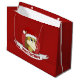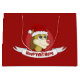 Gift Bag med en illustration av en söt lejon med rött julomslag; underbar dekoration för helgdagar till jul, redigerbar malldesign med anpassningsbar fält för egen text, illustrerad av Radka Kavalcova