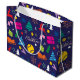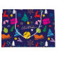 🎄 Jul đŸŽŸ tennis navy blue Large Gift Bag. FĂ€rgfulla julolikoner och gult tennis boll mot mörk blĂ„tt bakgrund.