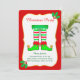 Söta tomtebyxor på röd bakgrund julfestinbjudan. Texten är redo att anpassas.