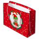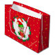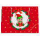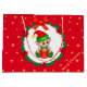 Söt julbaby tomte som håller en presentlåda i mitten av en tallkrans dekorerad med julstjärnor, röda bollar och gyllene stjärnor på röd bakgrund Presentpåse. All text är redo att anpassas.