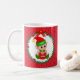 Söt jul tomte som håller en presentlåda i mitten av en tallkrona prydd med röda julbollar och röda hjärtan på röd bakgrund Mugg. Njut av den underbaraste och magiska tiden på året!